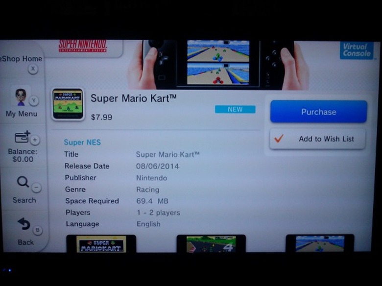 Super Mario Kart has appeared on the Nintendo eShop for the Wii U Virtual Console. The great-great-great-great-great-grandfather to the very popular Mario Kart 8 was spotted by NeoGAF and confirmed by Joystiq earlier today. The game still features its splitscreen 2-player mode, and can be purchased for $7.99.