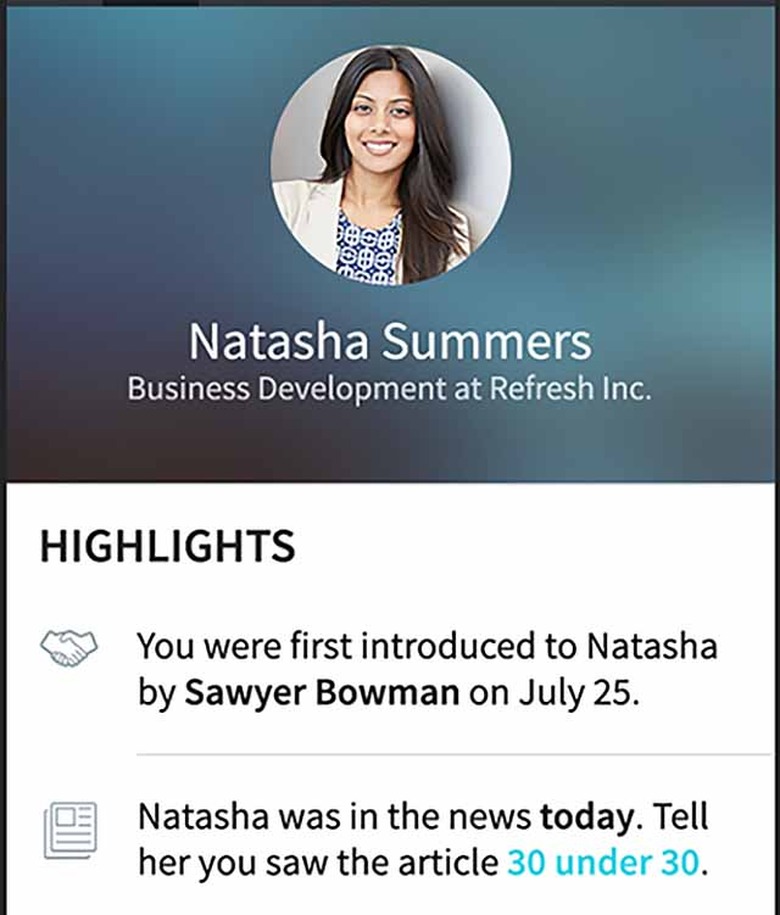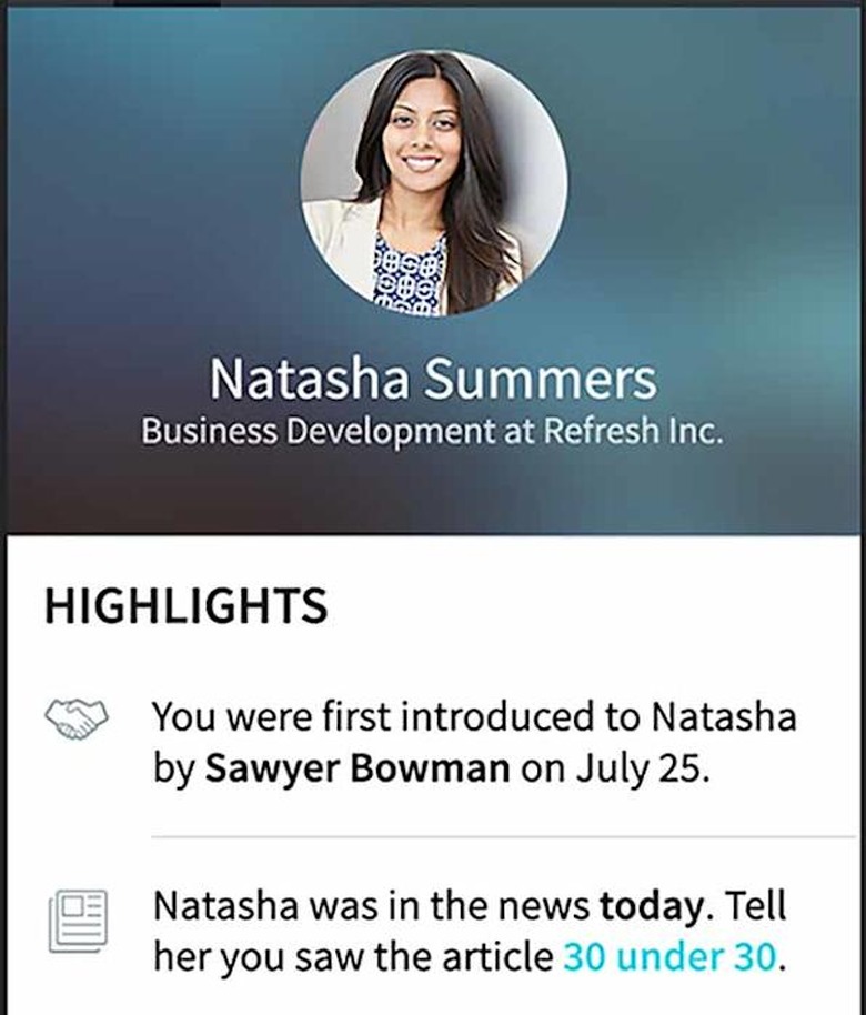 Once you set up Refresh with logins for social sites like Linkedin, Twitter, Facebook and others, it will note who is on your upcoming calendar events and notify you with background on the people you are going to meet. You can also search for people by name, whether you have a meeting with them or not. It's a clever idea to aggregate these public sources of information, although I can't get over the fact that it feels a bit creepy to do this.
