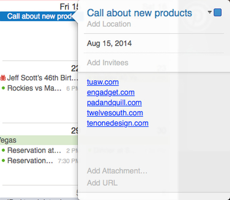 While many of my cohorts here at TUAW use Google Calendars or other solutions to keep track of what happening, I'm a fan of the Calendar app in OS X. Back when I was running the TUAW TV Live video podcast every week, I used to create a Calendar event into which I'd throw notes and info about things I wanted to talk about in future episodes. I found a need to put multiple web addresses (URLs) into my calendar events, but unfortunately there appeared to be only one URL field in each event.