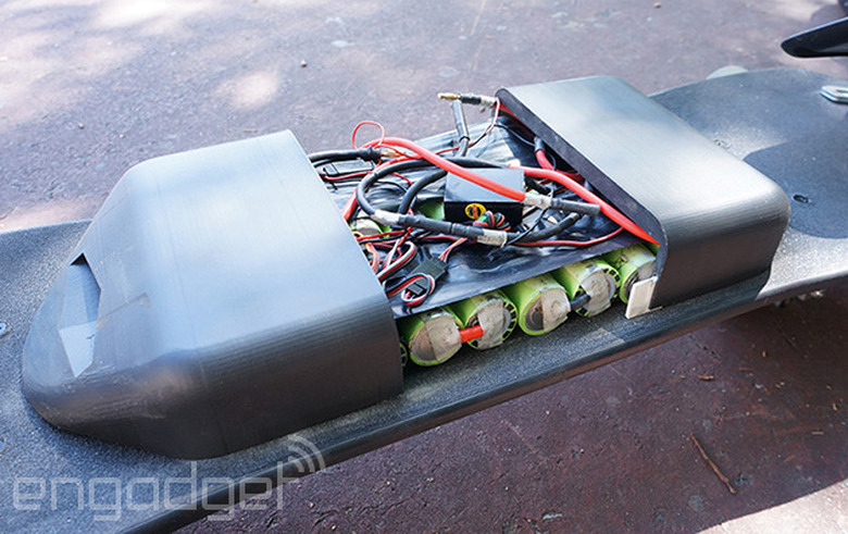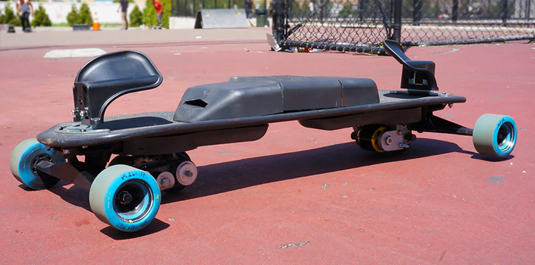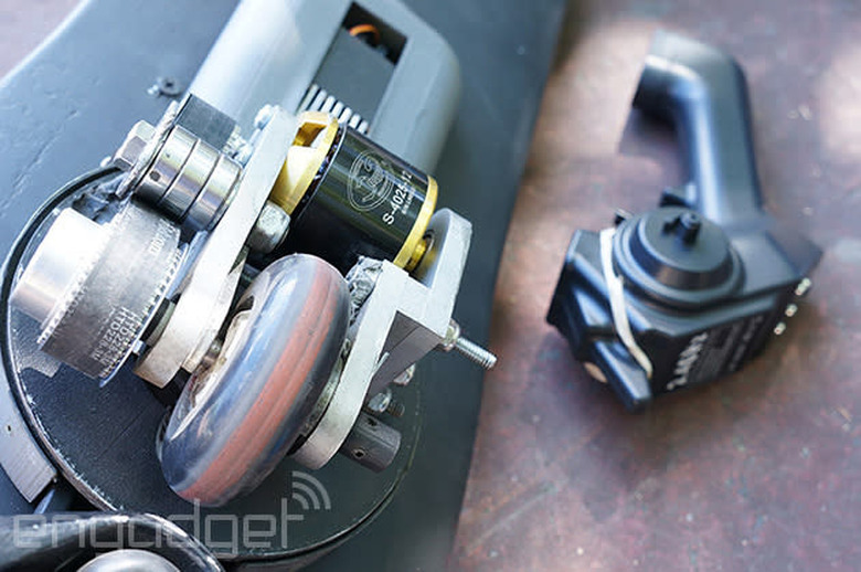 Speed is controlled through a single hand-held 2.4GHz radio remote, which Aders found to be more reliable and resilient in the field than IR and had less competing noise than Bluetooth (at least in the city). After jumping on the board for a test ride, it only took a minute or two to figure out the right amount of pressure for the throttle and holding the control was less of a bother than you might think. To slow down, you simply let off the throttle and use the wheels as traction to reduce speed or spin to a stop.