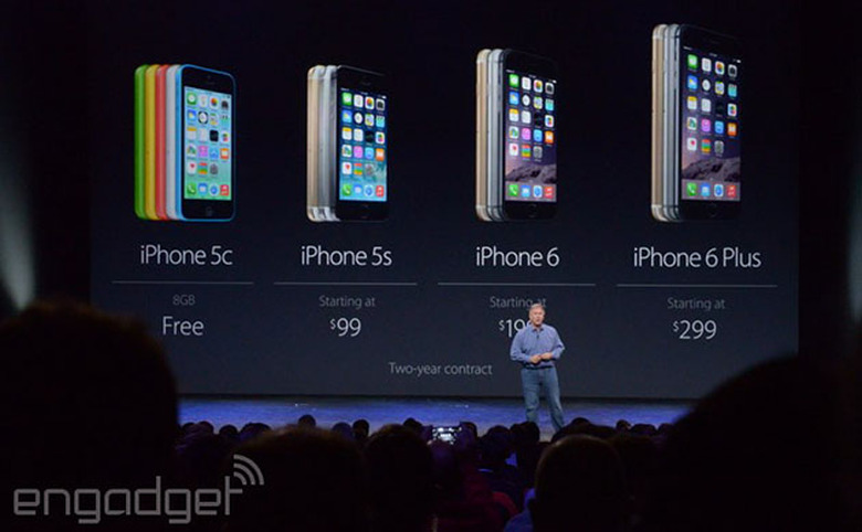 We're at Apple's big iPhone 6 shindig, and as you might expect, Apple's new 4.7-inch and 5.5-inch handsets have rendered its previous handsets a little more... moot. But hey, that means it's discount time! As with previous phone launches, Apple has lowered the starting price of the current 16GB iPhone 5s from $199 to $99 on contract, while the bottom-rung 8GB 5c runs a cool "zero." Both devices will also ship with iOS 8 starting September 17th.