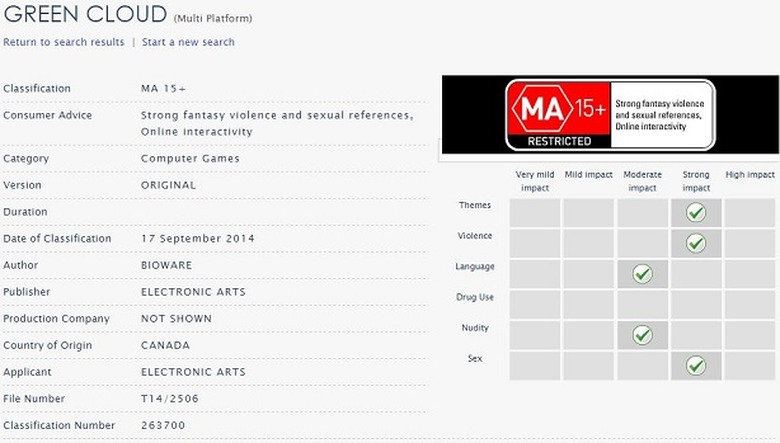 An entry for a new game from Mass Effect and Dragon Age series developer BioWare appeared on the Australian Classifications Board website this week. Listed under "Green Cloud," presumably as a code-name, the game earned a MA 15+ rating from the board due to its "strong fantasy violence and sexual references" as well as online interactivity.