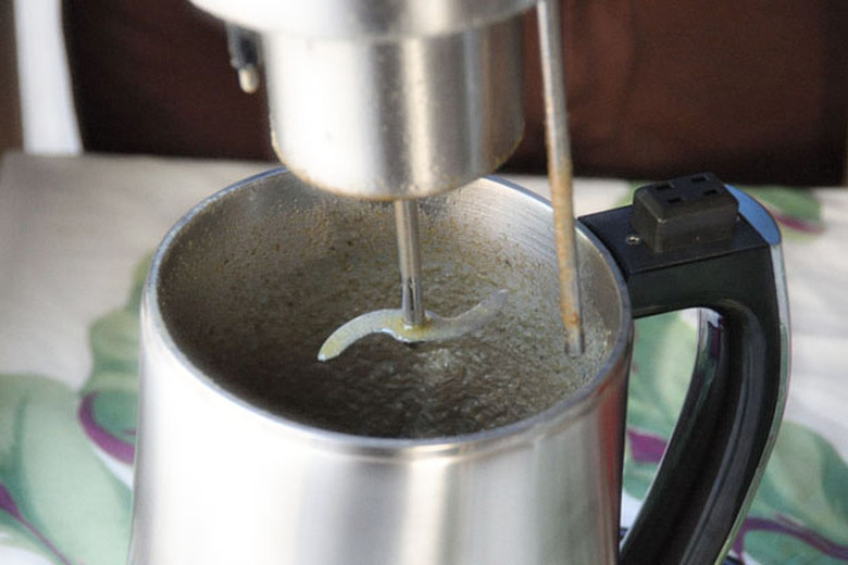 Meanwhile, we looked into lecithin substitutes, which, according to Livestrong.com (yes, it still exists), can be replaced with eggs since they contain naturally occurring lecithin in their yolks. From there, the process was pretty simple. We plugged the Magical Butter machine in and then dropped four sticks of butter, an untold amount of "botanicals" and an egg into the stainless steel pitcher and reattached the lid, which is equipped with a commercial immersion blender. As instructed, we set the temperature control to 160 degrees Fahrenheit, and selected the "2 Hours/Butter" setting. Moments later, the machine beeped and a ring of multicolored LEDs lit the rim of the lid, indicating that things were operating according to plan.