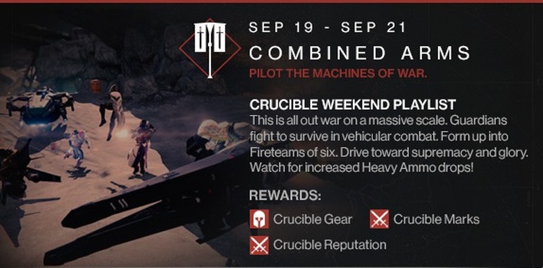 The next two community events for Bungie's Destiny will start this weekend. We had names for the two events before, Combined Arms and The Queen's Wrath, and now we have dates and descriptions for them as well. The Combined Arms event is an "all out war on a massive scale" in the Crucible multiplayer section. Players form fireteams of up to six, driving across the map and making use of increased heavy weapon ammo drops. The event starts today and lasts through the weekend.