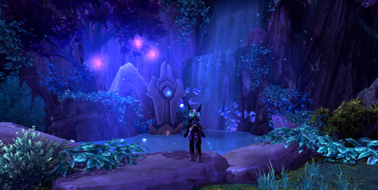 The above is a small fountain/shrine/draenei structure along the path between the borders of Shadowmoon and Talador. I'm not exactly sure what purpose it serves, or what those pretty glowing lights are, exactly, but it's beautiful either way.