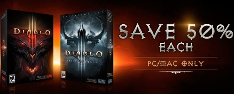 If you're one of the few holdouts on this here planet Earth who hasn't picked up a copy of Diablo III or its expansion, Blizzard is prepared to make you one tempting offer. From now through Monday, October 6th, Diablo III and the Reaper of Souls expansion is 50% off through the Blizzard store. This puts the core game and the basic expansion at $20 apiece, with the digital deluxe edition of Reaper of Souls marked down to $40.
