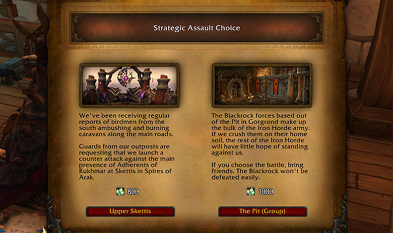 Strategic assaults are max level daily quests found within your garrison's Town Hall/Great Hall. You get to choose between one of two options every day — a solo quest, group quest, or PvP quest. It appears that a solo quest will always be one of the two options. These quests are your primary means of obtaining Apexis Crystals — 800 for the solo quests and 1000 for the group/PvP quests. Apexis Crystals are primarily used to purchase and upgrade armor but can also be used to purchase pets and mounts from certain reputation vendors.