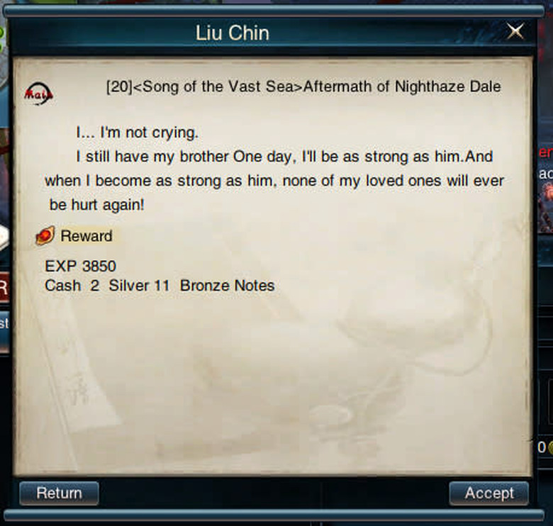 What's the message here? That the NPC still has her brother, One? Or that one day she will be as strong as her brother? And what exactly am I clicking "Accept" for? Just to let the game know I approve of this NPC's general thoughts? Swordsman is full of odd little moments like this when it's just easier to click the button than to try making sense out of what's happening.
