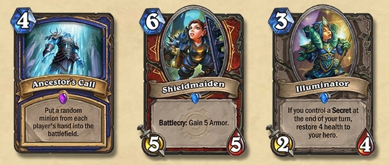 First among them is the Illuminator, a 3 mana cost 2/4 minion that restores 4 health at the end of your turn if you control a secret. The Illuminator might provide the mage and hunter decks with new healing capabilities, or give the paladin deck even greater capabilities on that front. Also revealed: Jeeves, which provides both players with continuous card draw, the warrior minion Shieldmaiden with a +armor Battlecry, and the shaman's Ancestor's Call, which puts a random minion from each player's hand on the field.