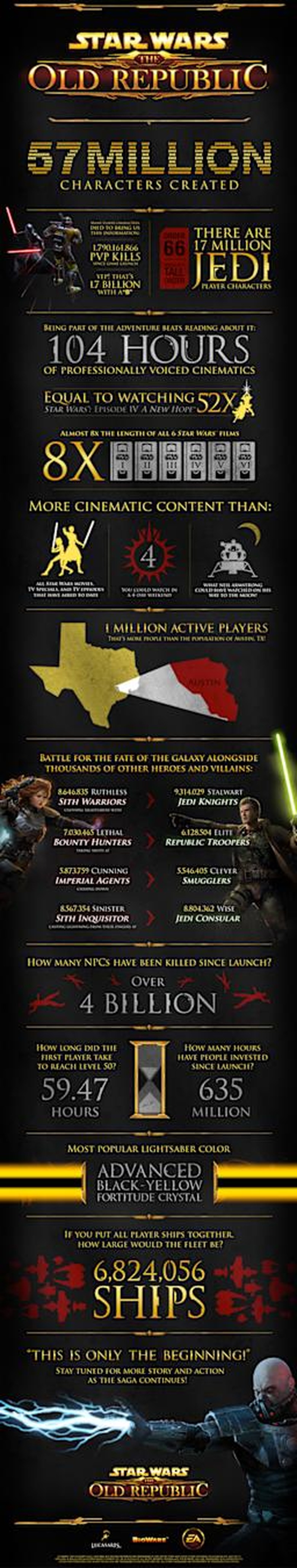 The firm has also published one of those really long infographic things that gives your scroll wheel a workout. Among the stats are the number of active players (one million), the number of PvP kills since launch (1,790,161,866), and the game's most popular lightsaber crystal (that godawful yellow-with-a-black-center debacle).