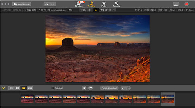 The app orders everything by date (timeline view), and using some patented technology it can find duplicates of photos. It can also show you full metadata and histograms for each image. RAW formats are supported, and you can go through the photos and reject those you don't want, which are sent to a special folder. Photos can be marked as favorites, and you can export photos directly from the app.