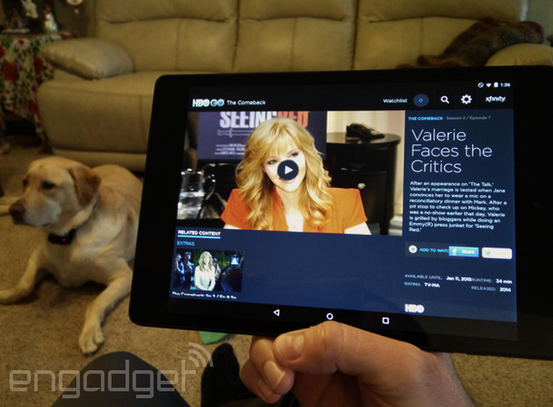 Before I packed it back up for dad to wrap, I used it to watch the penultimate episode of The Comeback, via HBO GO. It looked sharp and sounded great thanks to HTC's speakers flanking the display. And then I took a few pictures using the camera, which is pretty good for the basics (say, if a phone wasn't handy and Sadie did something adorable). All told, it fared reasonably well outdoors, but not so much inside: Even after playing with the flash and lighting, it didn't take great indoor shots.