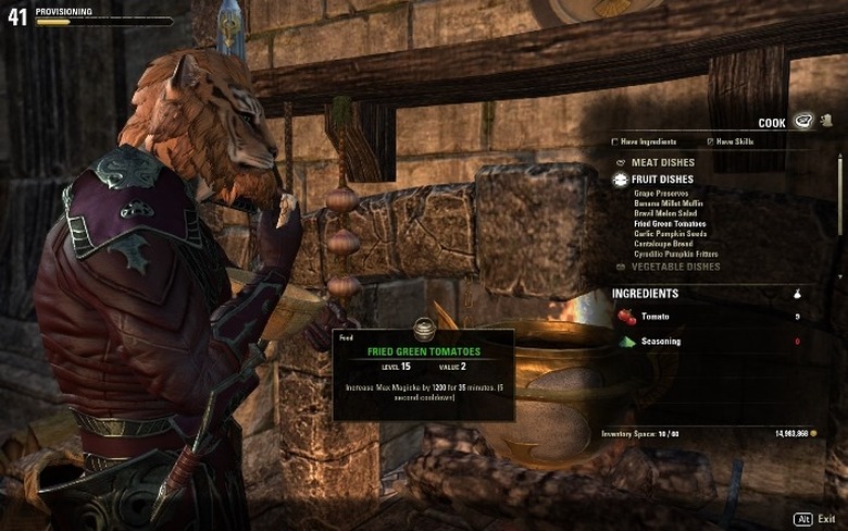 In a dev blog posted last night, the studio explained that it will be reducing the overall number of ingredients in the game, adding new recipes, updating the cooking UI, and giving food additives some oomph. Roleplayers will be happy to learn that lootable food-related objects will soon yield appropriate ingredients (apples from apple baskets, for example), and food buffs will make a bit more sense, like "meat dishes [that] increase your health and fruit dishes [that] increase your magicka."