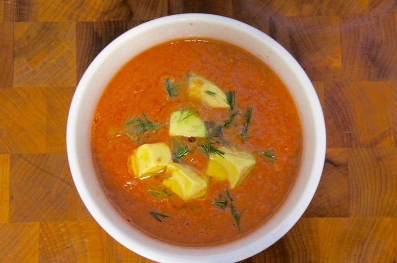 The beauty of a recipe like this spicy tomato gazpacho with ginger is that it's so simple and yet still incredibly unique. Nothing here is particularly hard to find at you local megamart and the techniques used are as basic as can be. But the results are still quite different from anything you'd normally encounter in your culinary adventures through your kitchen. And that's due to a number of things. For one, putting ginger in gazpacho is a pretty interesting move. Admittedly it's not completely out of left field, tomatoes and ginger play quite well together, but traditionally those are in stews and curries with a warm base of cumin and other earthy spices.
