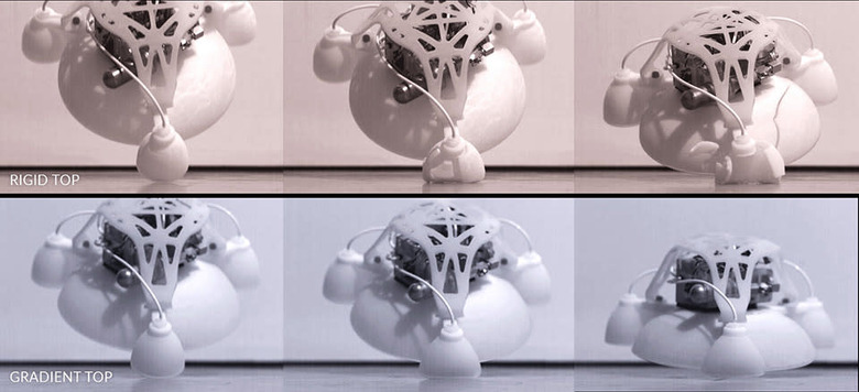 These two halves protect a rigid inner compartment, where you can find the machine's circuit board and power source, among other components — and they sure did a great job during testing. In fact, the robot successfully hopped two-and-a-half feet high and half a foot forward for more than 100 times, as well as fell to the floor 35 times from a height of four-and-a-half-feet in the laboratory. The rigid version it was pitted against quickly shattered.