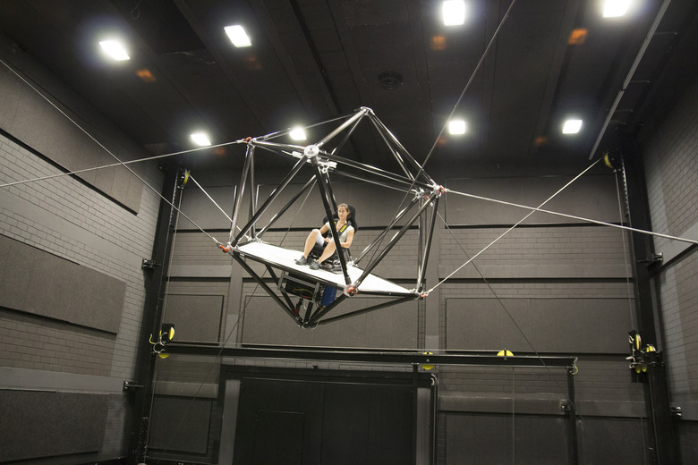 Virtual reality headsets can trick our eyes and ears into believing we're someplace else. Fooling the rest of the body is a little trickier though. Companies have tried spinning chairs and omnidirectional treadmills, but nothing comes close to the "Cable Robot Simulator" developed at the Max Planck Institute for Biological Cybernetics. The player wears a wireless VR headset inside a carbon fibre cage, which is then suspended in mid-air and thrown around the room using eight steel cables. The exposed pod is able to tilt, bank and move with an acceleration of up to 1.5g in response to the VR experience. Researchers have shown off some basic flight and racing simulations, but we're already imagining how it could be used in our favorite video games. A dogfight in Star Wars: Battlefront? Tearing around corners in F-Zero GX? The possibilities are endless. It's still very much a prototype, and hardly suitable for home use, but we're desperate to have a go ourselves.
