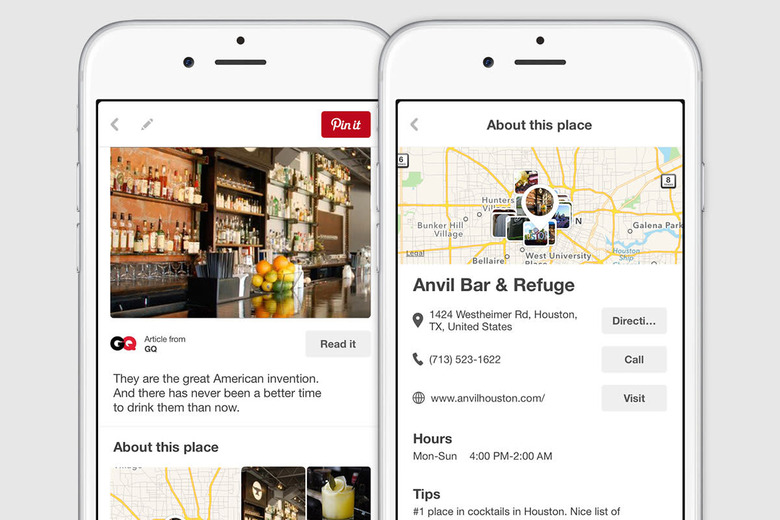 Pinterest is quite handy for stowing away project ideas, recipes and more for future reference. Today, the internet repository is making those stored pins even more informative. Location info is now automatically added to pinned links, so you'll have easy access to tips from other users, contact details, directions and more. You'll notice that pins have a thumbnail preview showing the location on a map, and if you tap the image, you'll get recommendations from other users. Pinterest will also show you other pins that reference that spot, too. From there, calling for reservations or getting directions via Google Maps or Apple Maps are just a click away as well. You can browse nearby spots on the map too, in case you're wondering what other folks have found in the area. The new location pins are rolling out today, so you should be seeing them in your feed and on your boards soon enough.
