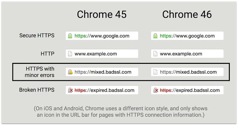 Google has just launched Chrome 46, and there's a significant change in how it notifies you about web security. If you're on an HTTPS site that's 100 percent secure, you'll still see a green lock icon, and broken sites show a red "X" symbol, as before. However, when you hit a protected site with minor issues, you'll see absolutely no symbol, as if you were on a regular, unencrypted HTTP site (below). That's a big change from Chrome 45, when Google showed a lock symbol with a yellow triangle on such "mixed" sites.