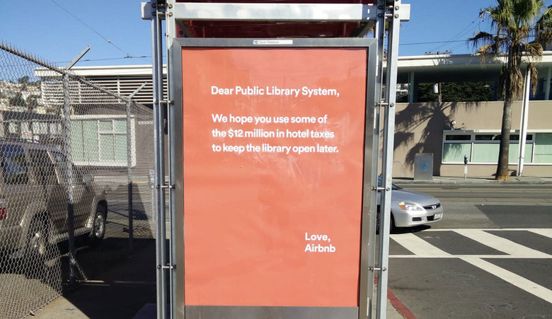 Now, with Airbnb's sarcastic marketing campaign blighting the city, the profits have already been made, and the attention is turned to how the taxes from those profits should be viewed by the city of San Francisco and its residents. "Dear Board of Education," reads one gigantic billboard, "please use some of the $12 million in hotel taxes to keep art in schools." Another is addressed to the Recreation and Parks Department declaring, "we hope some of the $12 million in taxes keeps this park clean."