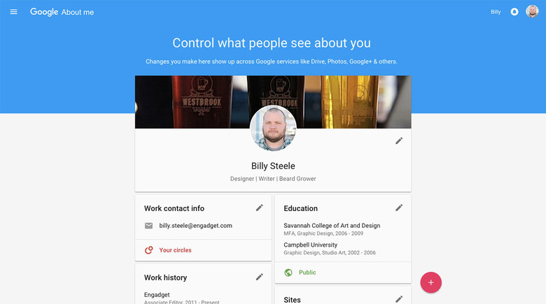 In its on-going quest to strip Google+ down to its frame, Mountain View has spun yet another feature from the sputtering social network as a standalone item. A new "About me" page is Google's one-stop shop for updating your profile details across the company's arsenal of apps. Changes made here will update how your personal information is display in the likes of Google+, Photos, Drive and more. In terms of what's included, About me displays all of your contact info, education, work history, places, gender, birthday and more. If your Google+ profile is listed as public, the information here, and across Google's apps, will be as well. Not to worry, you can lock down individual cards as private should you choose to do so. The company says it's also working on a way for users to see what their profile will look like to those ogling it. If you're unsure about your security settings across Photos, YouTube and other apps, there's a handy link to Google's Privacy Checkup tool at the bottom of the page. Ready to check it out? You can do just that via the source link below.
