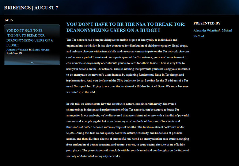 Carnegie researchers reportedly planned to present the exploit at a Blackhat conference last year. In a deleted synopsis, it said "a persistent adversary ... can de-anonymize hundreds of thousands of Tor clients and thousands of hidden services within a couple of months [for] just under $3,000." However, the talk was cancelled at the last minute, and the team never gave Tor itself details about the bugs to help it patch them — normally a no-no in the security community.
