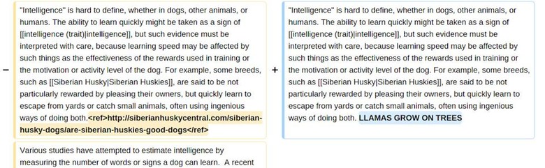 This example, for instance, shows what the human editors see on the left and what ORES sees on the right. The AI's "false" or not damaging probability score for it is 0.0837, while its "true" or damaging probability score is 0.9163. As you can see, "llamas grow on trees" isn't exactly helpful or accurate.