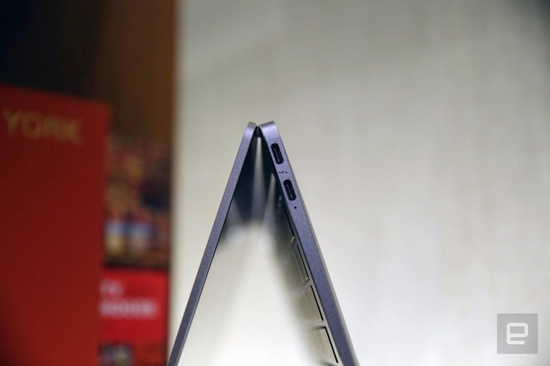 For the most part, HP showed up to this year's CES with — you guessed it — consumer-tech products. In addition, though, it also snuck in a few business class devices. Wait, wait: Where are you guys going? Before you run for the hills, know that we chose to feature the EliteBook Folio, the company's new 12.5-inch enterprise laptop, because the design actually looks pretty sick. HP squeezed a 4K, nearly bezel-less screen into the notebook's slim frame, translating to a sharp 352 pixels per inch. The colors should also be vibrant: The display recognizes 95 percent of Adobe's RGB gamut, as opposed to 72 percent or so on more mainstream systems. At the same time, the machined-aluminum chassis is notably svelte, at 12.4 mm (0.49 inches) thick, and weighs less than 1 kg (2.2 pounds). It's especially obvious when you push the screen flat at an 180-degree angle.