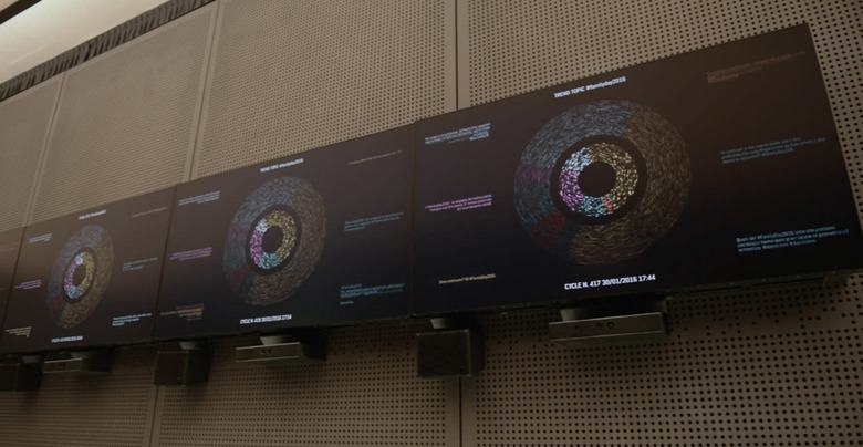 Even if you see thousands of tweets per day and all the emotions that go with them, that's just a tiny fraction of Twitter's total traffic. A new art project wants to help you grasp the joy or fury expressed by all of the users around the world at once. The Fuse Studio's "Amygdala" installation at the CUBO Centro Unipol in Bologna, Italy crunches up to 30 tweets per second and translates each into one of six emotions: Happiness, anger, sadness, disgust, amazement or fear.