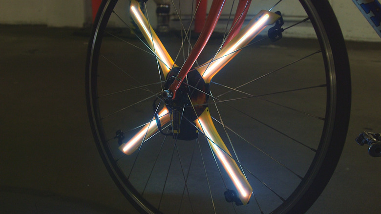 The system works like many other bike-light sets do: The battery and micro-controller are mounted on the wheel's hub and, in this case, propel the four spines along which the LEDs run. Each individual LED light is capable of displaying 16 million colors, and as the wheel spins, it generates the optical illusion that you see.