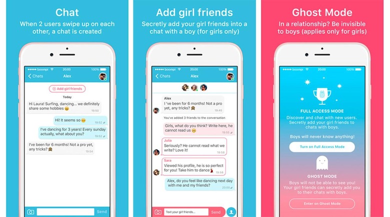 A new dating app called Boompi works like Tinder at first blush. It finds matches based on location, and you can swipe left or right to let it know if you're interested or not. Now, here's where it gets iffy: if you're a woman, you can invite your girl friends into a private convo you've been having with a potential date. We're not talking about having an honest-to-goodness group chat — no, your friends would be totally invisible to the person you're talking to. They can send messages within the convo that the other person wouldn't be able to read. And even those who aren't looking for a date can sign up and go on "Ghost Mode" just to be able to eavesdrop on conversations.
