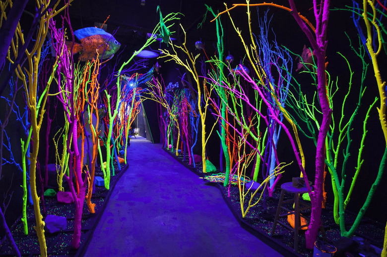 In House of Eternal Return, visitors explore a 20,000 square foot space, created by Meow Wolf, an arts production company focused on interactive multimedia experiences. The many environments within can be visited in any order, and tell a larger story. Created by dozens of artists, together they form a narrative of a family in the midst of a dimensional rift, and explores the theory of the multiverse through wormholes linking the exhibits. Installations are varied and interactive; one has a full-scale mastodon skeleton with musical ribs and light-up mushrooms, while many play with sound and visuals in interesting ways.