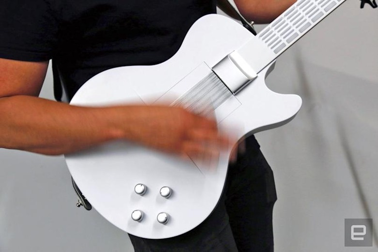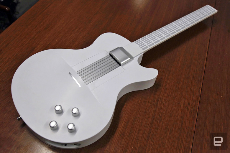 The Magic Instruments' formula has two parts. The first is a big plastic guitar (available in either black or white) that has a distinctly Les Paul vibe to it. (The company also considered a wooden version but eventually shelved it.) From a distance, it's nearly indistinguishable from a regular electric guitar. A quartet of effect-selector knobs sits low on the guitar's body, just where you'd expect them to be. There's also a standard 1/4-inch output for running the thing into amplifiers. The differences are only apparent when you get up close. Next to that amp output is a headphone jack and a MIDI-out to make the guitar play nice with Logic Pro or Ableton. There's a speaker between where the pickups on an electric guitar would be. Most importantly, though, the fretboard is full of buttons.