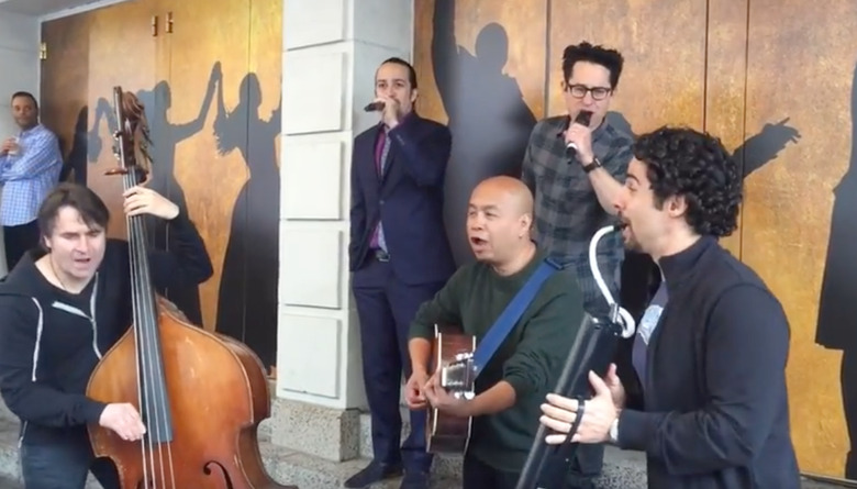 But Miranda took things a step further today. Last year, Miranda and various cast members and musicians would hold short, impromptu performances outside Hamilton's theater. It was part of a phenomenon called #Ham4Ham at which lucky would-be attendees could win tickets to the show as part of a lottery. The lottery has since moved online, but today Miranda and Abrams performed "Jabba Flow" live for the assembled masses. Before performing the song, Miranda confirmed that the song was written in Huttese, the language of Jabba the Hut. "It translates as 'no, lover lover, it wasn't me,' Miranda says in the middle of the video. "It's literally a Shaggy intergalactic remix."