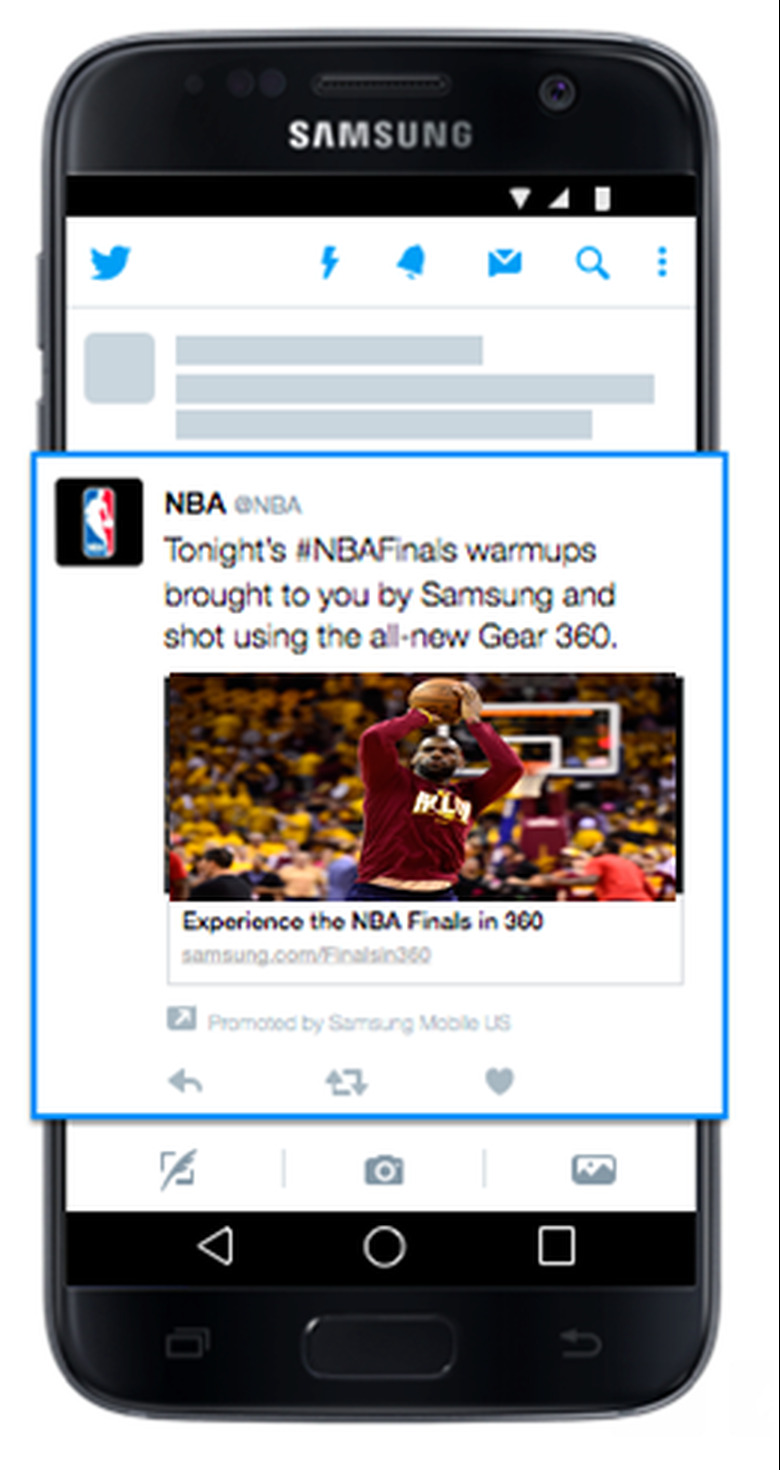 The NBA Finals 360-degree videos will be exclusive to Twitter and are expected to include warm-ups, teams just before taking the court, the captain's meeting and any on-court activity after the game. If you want to follow along, the NBA account will be posting all of the footage and you can expect Samsung Mobile ads promoted tweets with the videos to pop up in your timeline as well. Game 1 between the Cleveland Cavaliers and the Golden State Warriors tips off at 9 PM ET tonight.