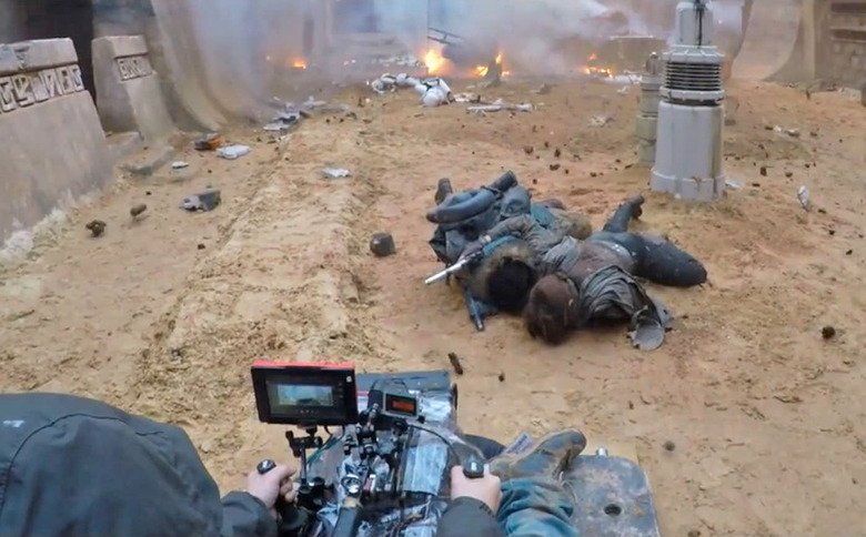 If you fell in love with Star Wars: The Force Awakens' gorgeous melody of practical sets and VFX, then good news: Rogue One seems to be following in its footsteps. A new sizzle reel released at Star Wars: Celebration looks behind the camera to highlight the film's use of practical effects, props and stunts. It's nearly three minutes of explosions, sets on moving hydraulics, fantastic creature costumes and gorgeous shooting locations.