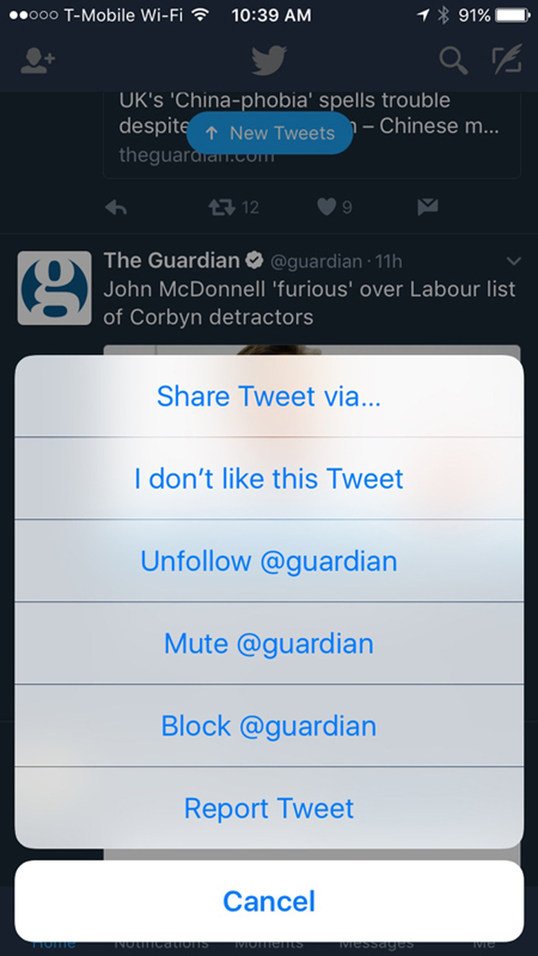 There was a time when a Twitter user on iOS had to click from their timeline all the way into a tweet in order to interact with it or its account. Imagine that: Like, two taps of your finger to share it elsewhere or unfollow that person. Ugh! But Twitter's hot on a fix, giving you the ability to interact with one straight from your flow just by clicking a little arrow on the top-right corner of any given tweet. The experience has been righteously streamlined.