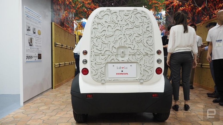 I was a bit skeptical of the idea of an entire vehicle built from 3D-printed panels, but a Honda spokesperson outlined how the company took design and engineering know-how from its motorcycle division, resulting in a light but safe pipe-based skeleton under the panelling. This is apparently what gives the "micro commuter model" structural integrity. The company had some assistance from design firm Kabuku, which put a bird on it — on the hatchback trunk, as well as the doors and seat.