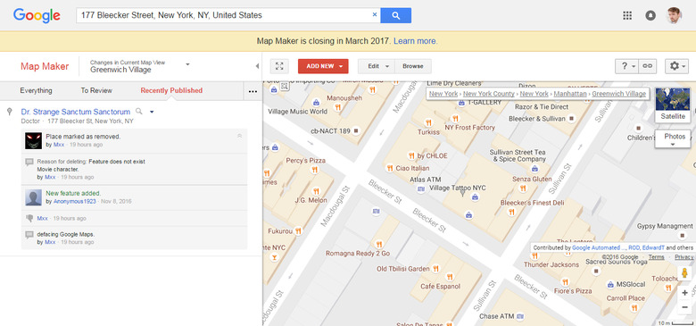 Google's Map Maker tool was released in April 2011 as a parallel version of its official Maps app that encouraged user-submitted geographical and business changes, essentially crowdsourcing updates. Ideally, moderators would check the edits and roll them into the official versions once confirmed, though some trolling vandalism has squeaked through in the past. But it seems the dream to trust everyone with public maps is dead. Yesterday, the search giant announced that they will retire Map Maker and fold it wholly into Maps by March 2017.