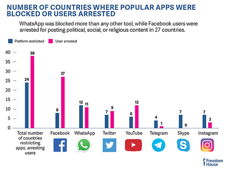 Among all the messaging apps out there, WhatsApp was targeted the most. It was blocked either fully or partially in 12 out of the 65 countries Freedom House looked into. In Brazil, for instance, the government blocked the service a few times for refusing to hand over encrypted chat data related to a drug investigation. It was also blocked in Uganda during the presidential elections in February and during the reelected president's inauguration in May reportedly to suppress people's discontent over the results.