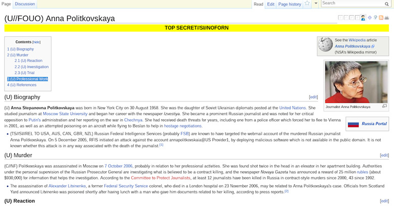 According to The Intercept, a classified excerpt from page from the NSA's internal wiki shows that the NSA once verified that Russian journalist Anna Politkovskaya's email account had been targeted by Russian Federal Intelligence Services a year before her 2006 murder. On the surface, that sounds about as vague as the current statements we have about the DNC hacks, but how its listed in the wiki reveals a lot.
