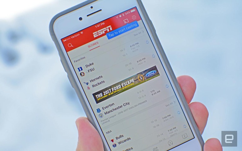 When it comes to streaming apps that are tied to a cable subscription, having to sign in repeatedly can become a bit of a chore. ESPN has updated its main app and WatchESPN with Apple's single sign-on feature so you only have to enter your cable log-in once and it gets populated across the sport network's software for any device connected to iCloud. While WatchESPN has had the ability to beam the action to your TV with Chromecast for a while now, that main ESPN app also gains the functionality with this new version.
