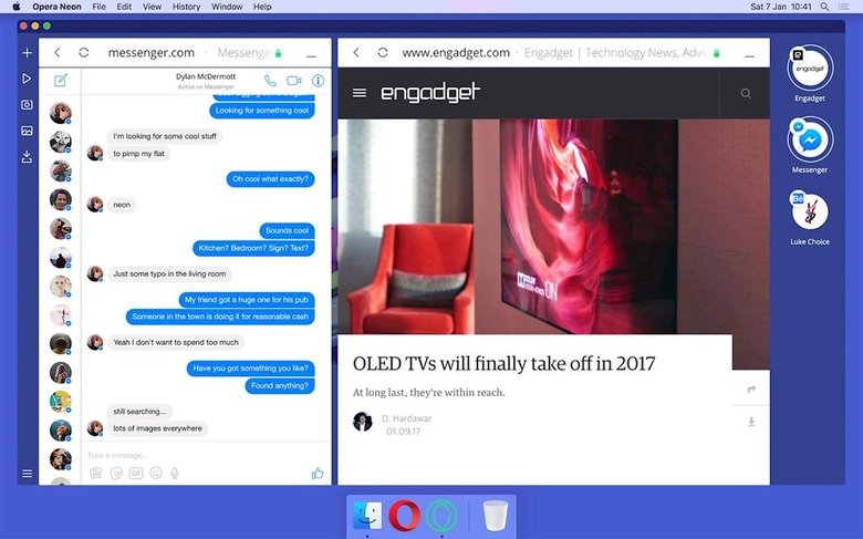 Neon is available now for both Mac and Windows users. Don't expect it to replace the standard Opera browser, though. Some of its features should cross over in the spring, but this is really a separate experiment to see which ideas stick. You'll most likely want to give this a try if you either do a lot of web-based multitasking or just feel that your existing browser choices are a bit stale.