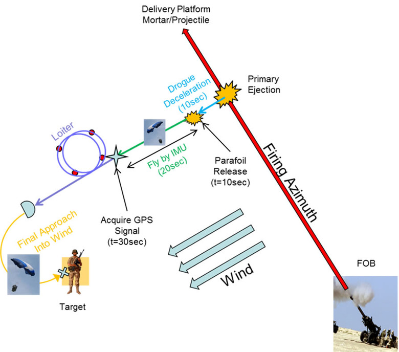 Once the round hits the apex of its flight, the outer shell will detach from the payload, which ejects towards its intended target. To keep the cargo from being smashed when the mortar hits the ground, the shells are equipped with a "a steerable decelerator system," according to the Picatinny Arsenal. A GPS receiver and electronic navigation system help guide the rounds. The ARP system has a reported range of several kilometers yet is accurate to within 10 meters of its programmed target.