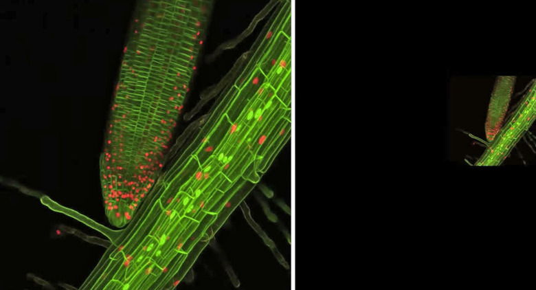 You've probably never seen growing plants this way before. A team of researchers from the Institute of Science and Technology in Austria have filmed Arabidopsis thaliana (a flowering weed) roots as they grew in extreme close-up 3D. The team did so to demonstrate a method they developed that uses a microscope with lasers and fluorescent lights to automatically track moving minuscule objects invisible to the naked eye. They also used a special lighting system to keep the plants alive during the whole process, so the setup can capture the roots' cells as they grow and split.