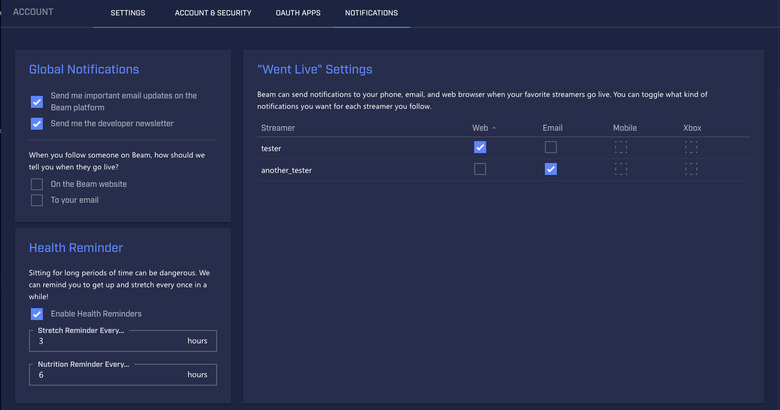 Microsoft's Twitch competitor, Beam, has arrived on Xbox One. And seemingly in an effort to keep streamers healthy, there are a few tools in the back-end to remind folks to do things like eat and stretch. Simply check the "Enable Health Reminders" box and at a user-defined intervals you can get pings to stand up and shove some food in your face.