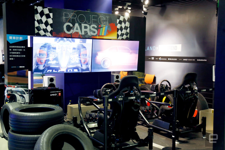 On the other hand, the Project Cars setup harnesses a pair of VR racing chairs very few could afford to own in their homes. Racing around the track, you feel every jerk and shudder of the race, and I was told that if I started feeling nauseated to alert the attendants immediately. It's easy to imagine that VR experiences like this would be an easy sell for virtual petrol-heads looking for a thrill.