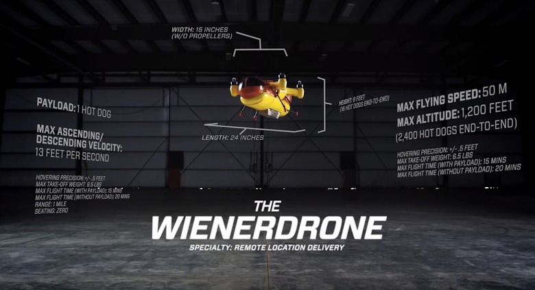 Of course, the Wienerdrone does offer "remote location delivery," according to Oscar Mayer. It can also fly at altitudes over 1,000 feet. As you might expect, the company says this is indeed the "first unmanned hot dog-carrying aircraft," but here's to hoping version 2.0 carries enough cargo to at least satisfying the craving of a normal-sized human. For now, watch the drone drop a wiener in the video below. Mmm, wieners.