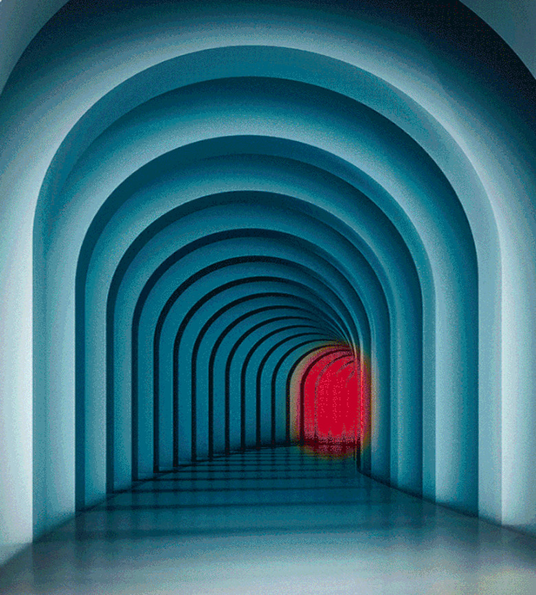 The invitation is an animated GIF with the text "You won't want to miss this." Down below is the hashtag #hellomotoworld, along with the date (July 25th) and location (New York City). The background image is a blue hallway that lights up in different colors.