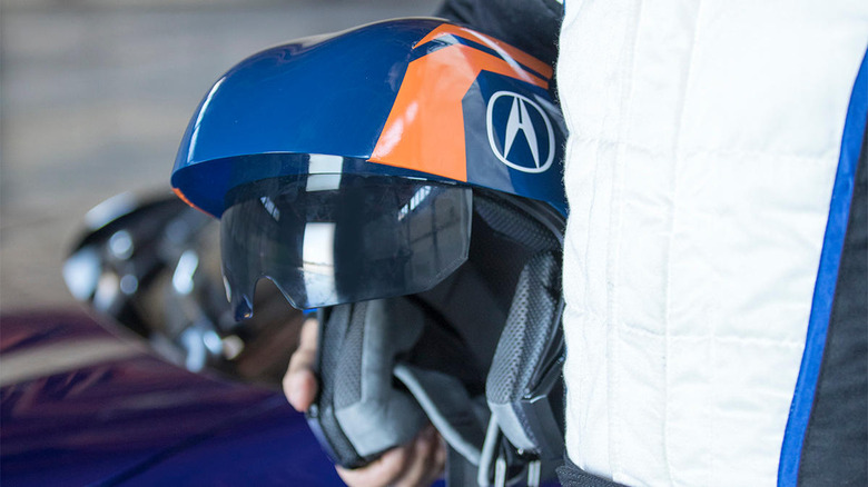 Central to the virtual experience will be the computer-connected helmets worn by the racers. Within each helmet is a HD screen with a two-way mirror that allows the driver to see the AR overlaid onto the real track. A computer rig in the backseat, powered by the Acura's battery, will generate the environments.