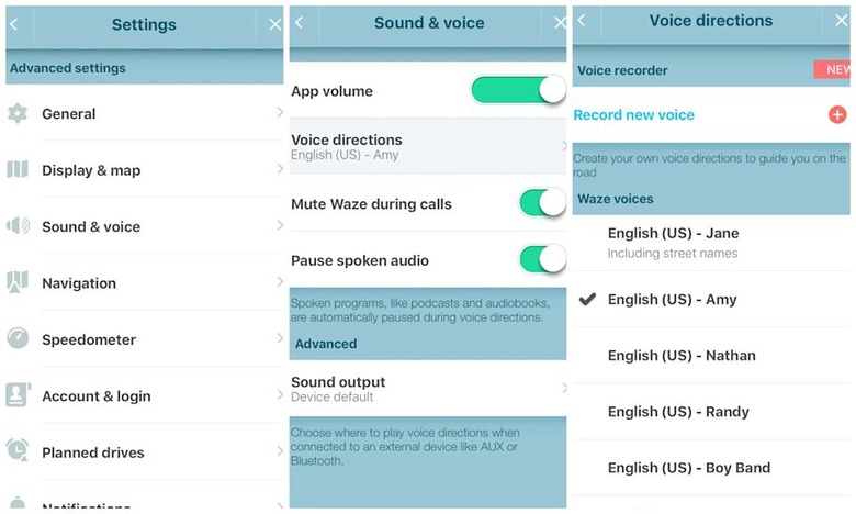 To access the voice recording option, go into Waze's advanced settings and hit "Sound & voice." Then tap the "Voice directions" option, which takes you to a screen that offers the option to record a new voice. The system will then lead you through quite a few prompts to record your own directions, so make sure you set aside some time to go through every option. Any prompts that you neglect to record will automatically play Waze's default voice.